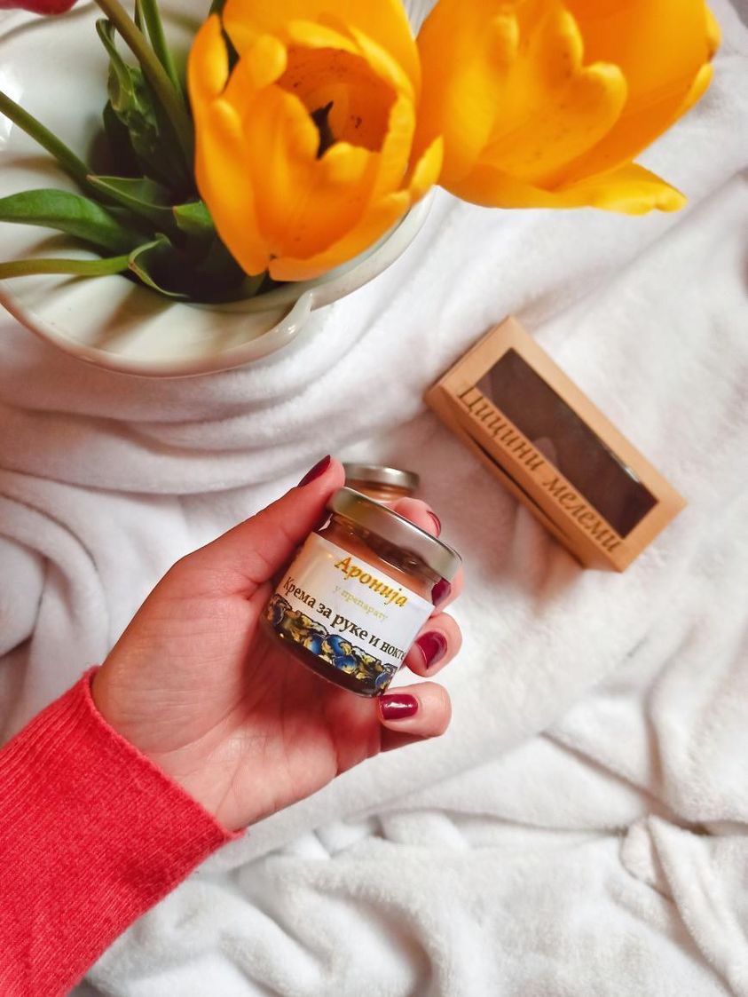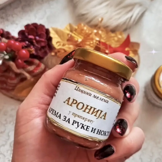 Састав: пчелињи восак, мед, сок и уситњене бобице ароније, екстракти лековитог биља у нерафинисаним биљним уљима (камилица, лаванда, жалфија, рузмарин, хајдучка трава, невен).